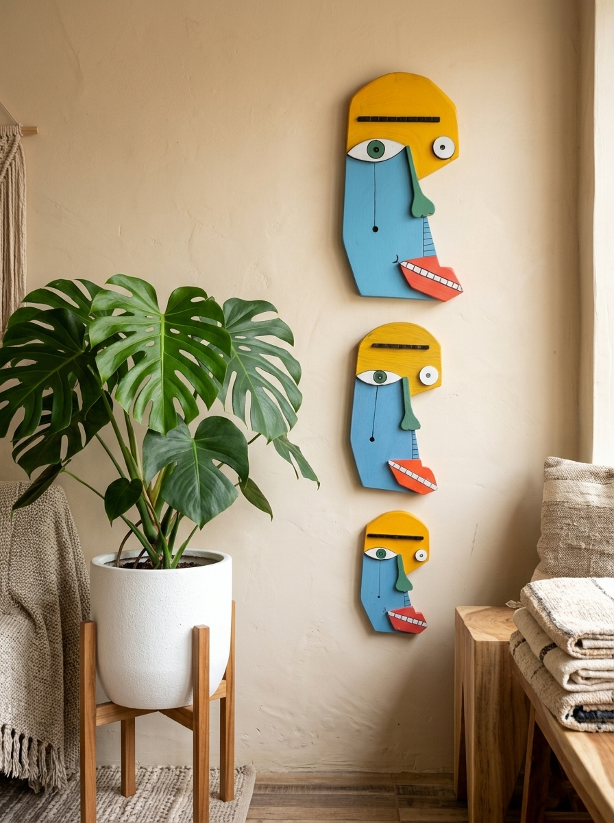 The Modern Muse Wall Deco is a striking set of three hand-carved wooden masks that bring a bold, avant-garde energy to any interior space. Inspired by abstract cubism and neo-expressionism, each mask features a playful rearrangement of facial features—stylized eyes, a prominent nose, and a vibrant red mouth—creating a series of unique “muses” for your wall. The sculptures are hand-painted with matte pigments that emphasize their geometric silhouettes and layered wooden textures. Arranged in a vertical trio or scattered across a feature wall, these pieces act as an instant conversation starter, perfect for creative studios, eclectic living rooms, or modern gallery-inspired hallways.