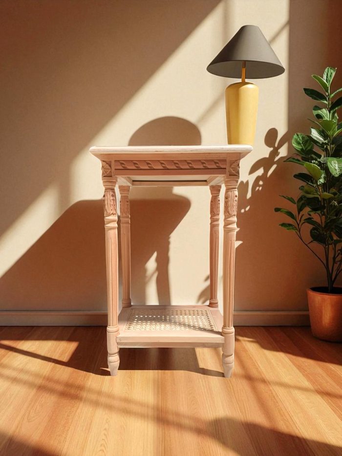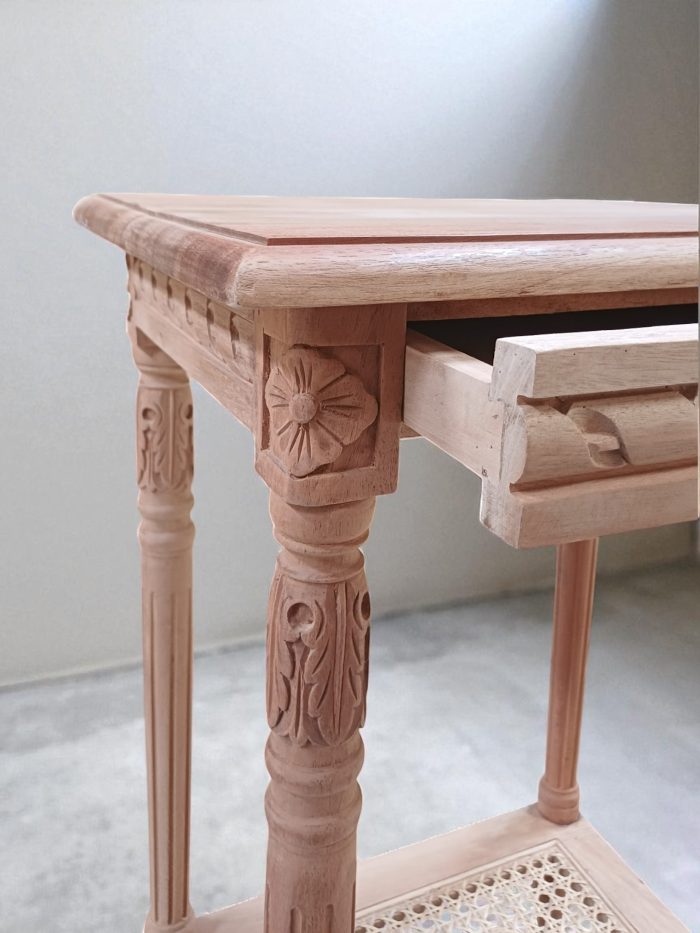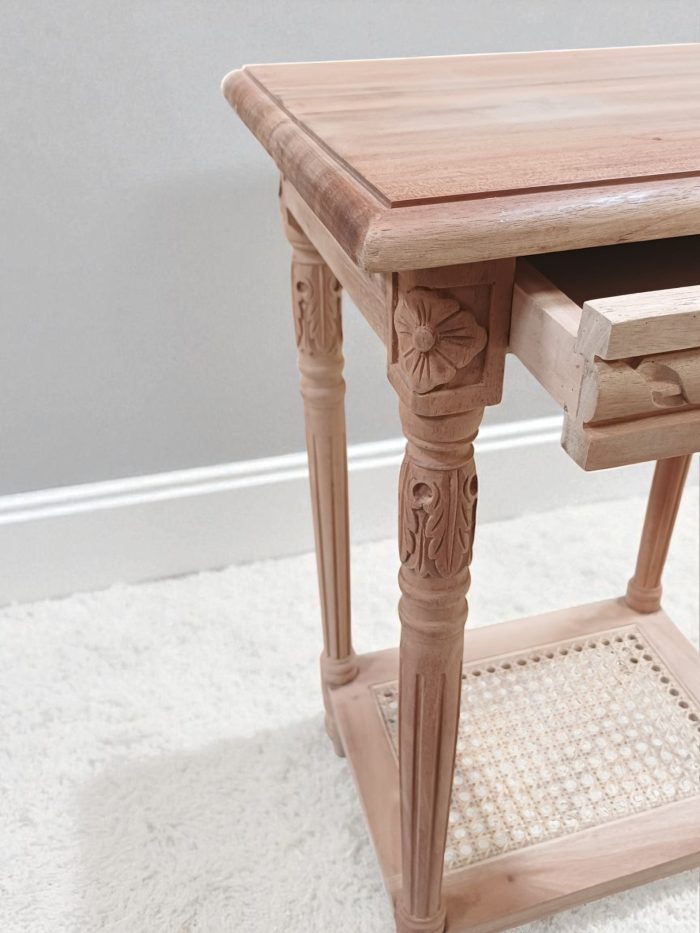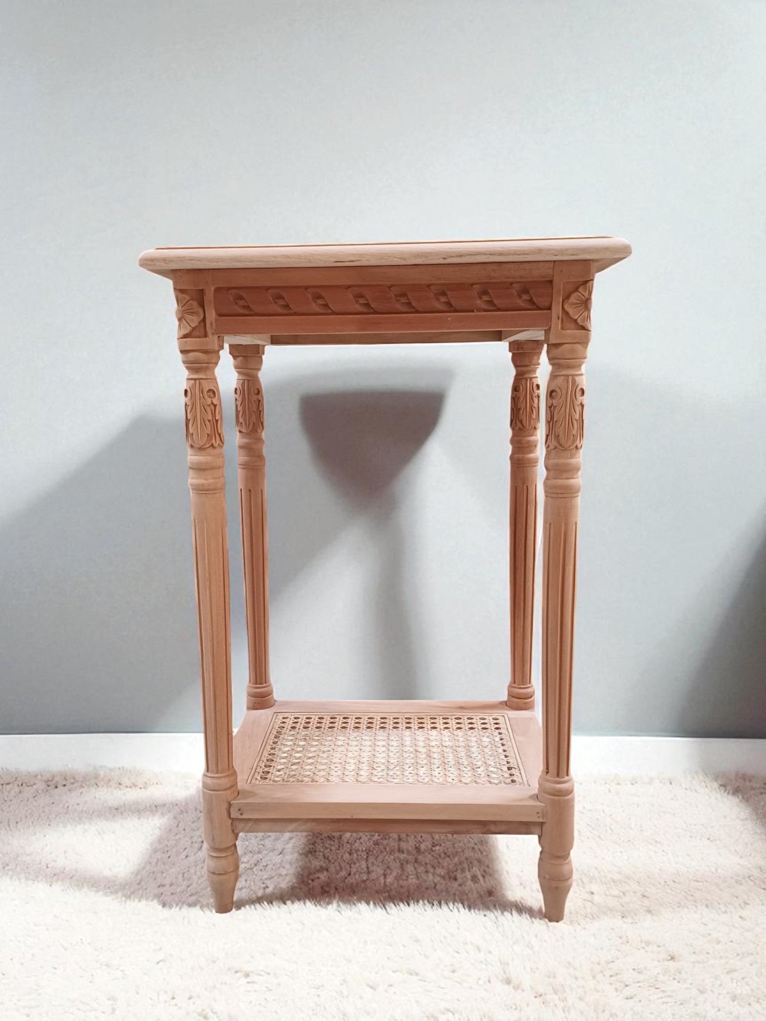 The Beside Rattan with a Secret Drawer is a charming and practical side table that combines intricate craftsmanship with a clever, functional design. Its frame is made from beautifully carved solid wood, featuring detailed carvings on the legs and apron that add a touch of traditional elegance. A lower shelf with an airy rattan weave provides a perfect spot for books or a basket, while a hidden secret drawer offers discreet storage. This piece is ideal as a stylish bedside table or a functional accent piece in a living room, blending timeless detail with modern utility.