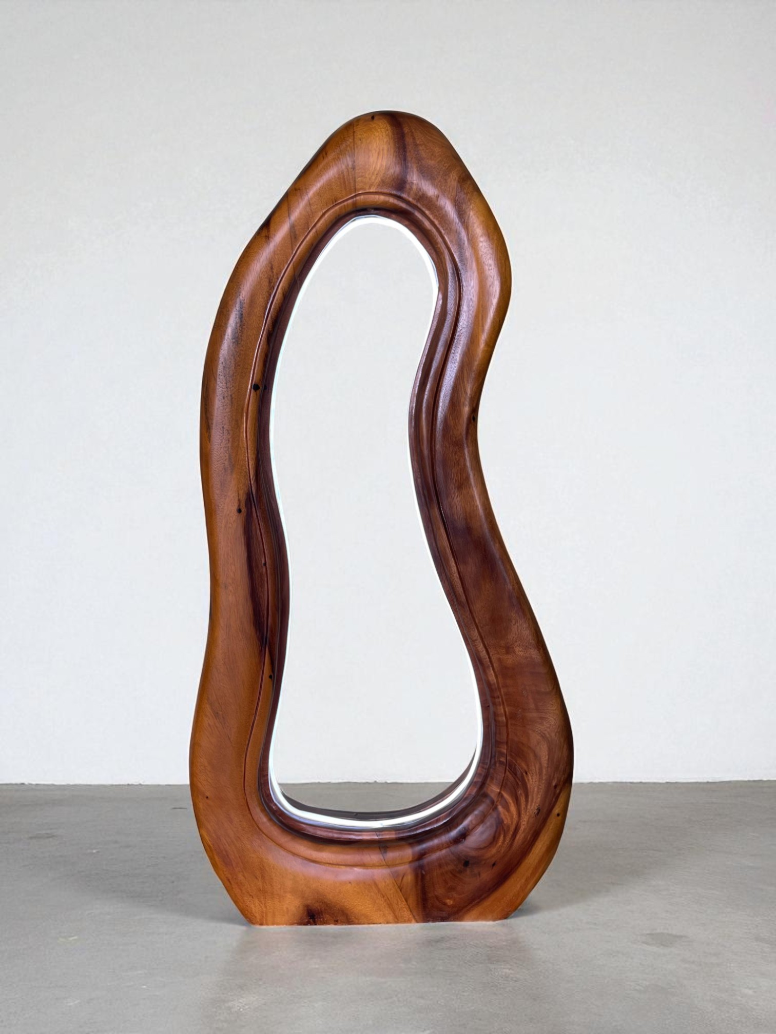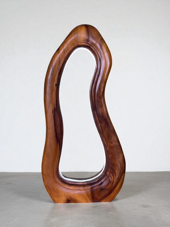 Handcrafted from solid teak wood, its form is a beautifully organic, free-flowing shape that resembles a melting or fluid frame. An integrated LED light source traces the inner edge of the wood, casting a soft, warm glow that highlights the rich grain and natural beauty of the material.