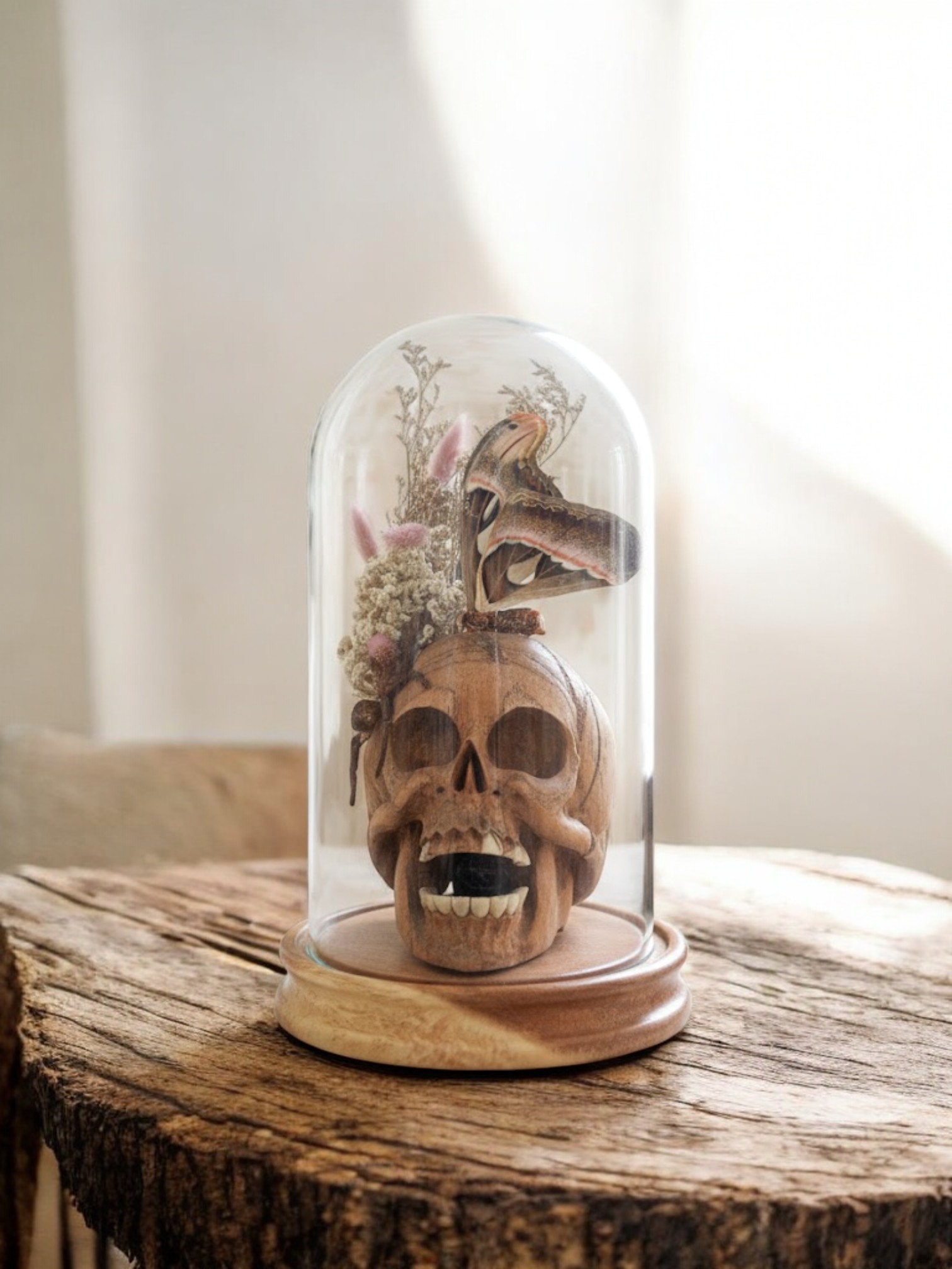Materials: Hand-Carved Wood (Skull & Base), Glass (Cloche), and Natural Dried Botanicals.