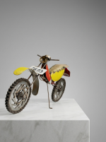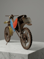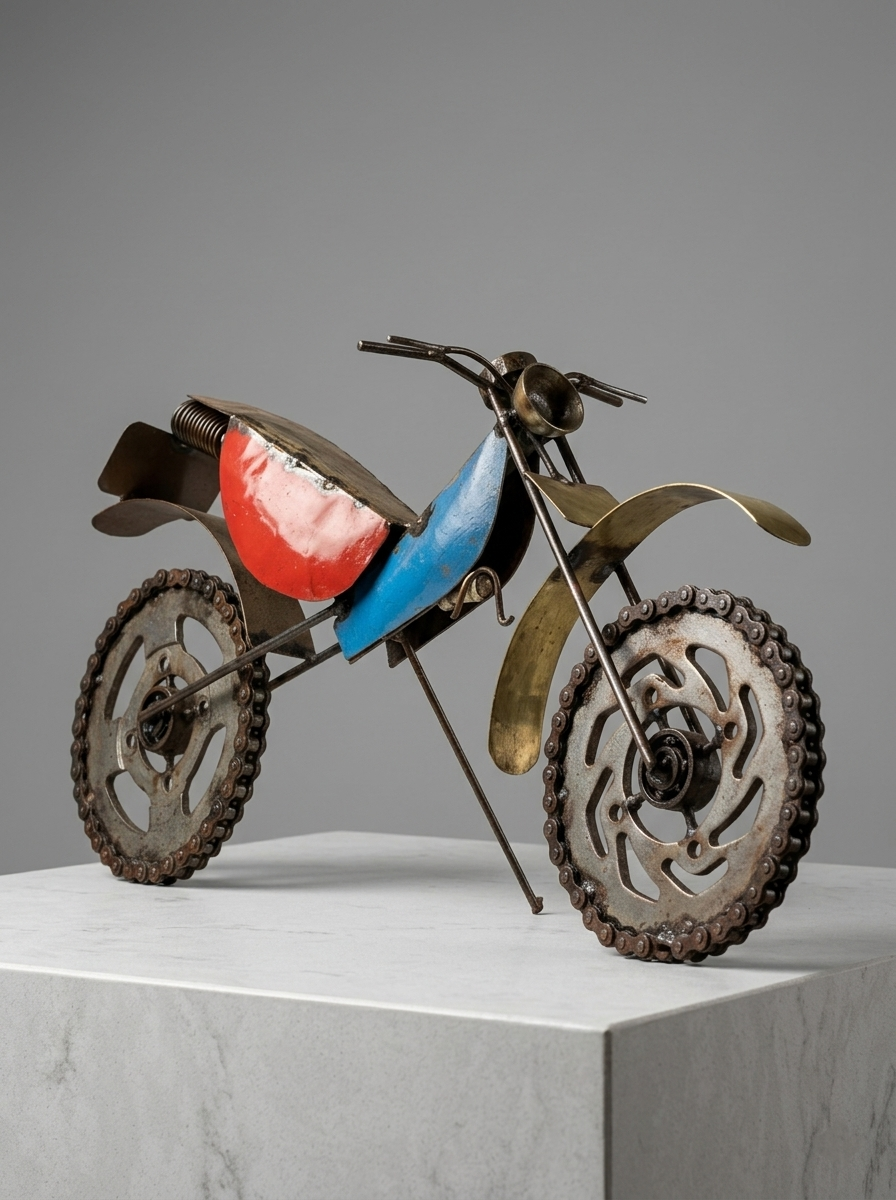 The Iron Rider Moto-Art (TF128DL) is a dynamic desktop sculpture that captures the raw energy of off-road motorcycling through expert upcycling. This piece is masterfully constructed from high-grade industrial salvage, featuring rugged drive chains that serve as tire treads and heavy-duty gear cogs as wheels. The sleek, minimalist frame is accented by vibrant reclaimed metal fairings in primary colors, creating a striking contrast against the exposed mechanical components. Hand-welded and finished with a protective clear coat that preserves its authentic industrial patina, this sculpture is an essential statement piece for motorcycle enthusiasts, mechanical engineers, or anyone who appreciates the “revived” beauty of industrial folk art.