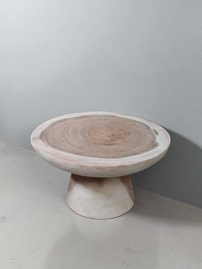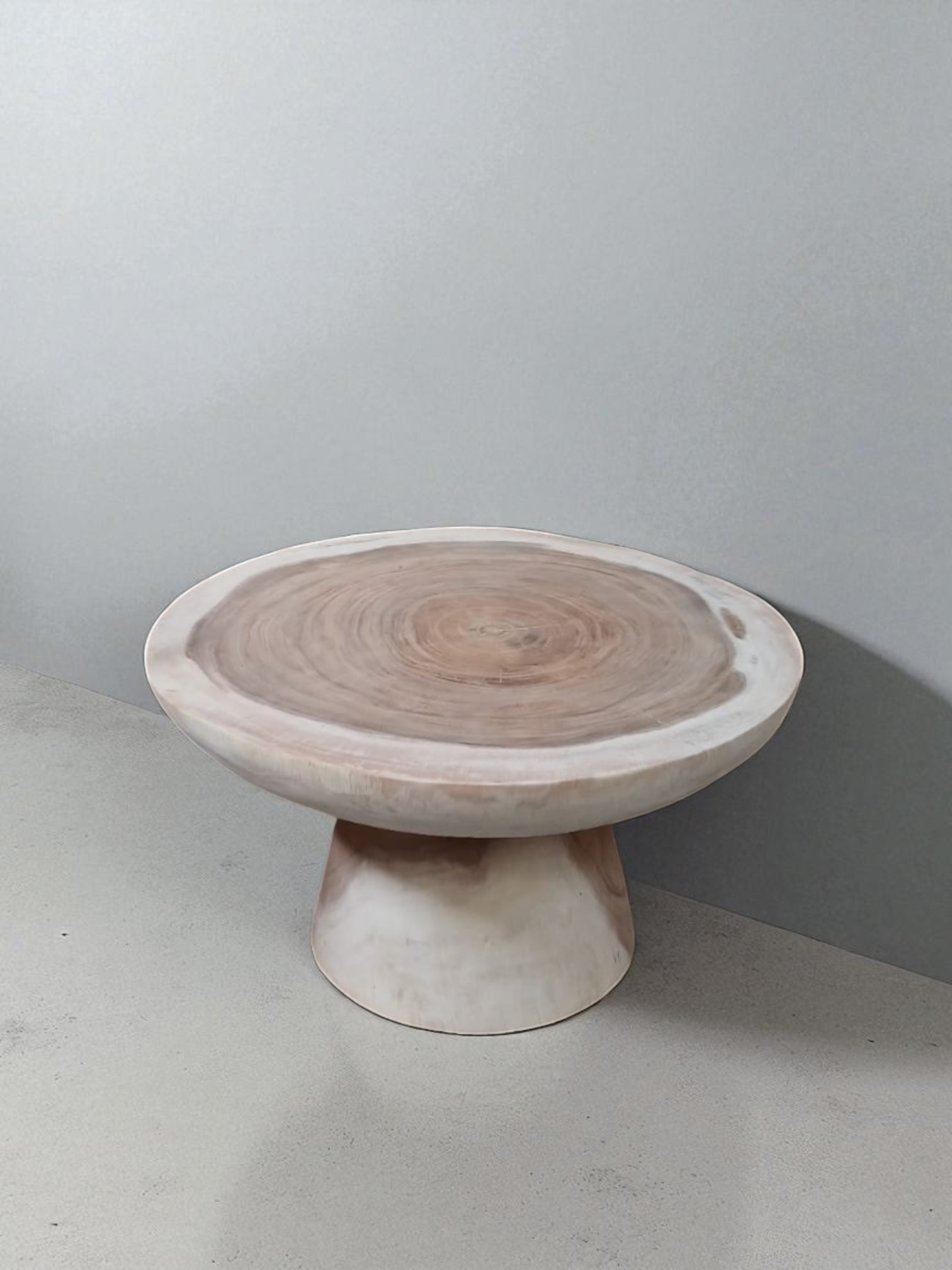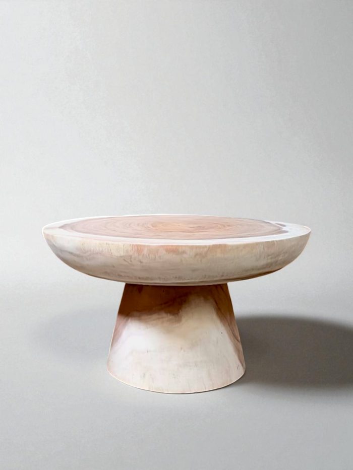 The Koa Coffee Table is a magnificent piece that celebrates the raw, organic beauty of wood. Expertly crafted from a single, solid piece, its thick, round top showcases a stunning and unique natural grain pattern. The base is a sculptural, tapered cylinder that gives the table a grounded, yet elegant presence. Finished with a light, bleached tone, the table highlights the wood’s inherent variations, making it a beautiful and durable centerpiece for any living room.