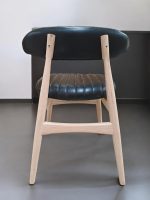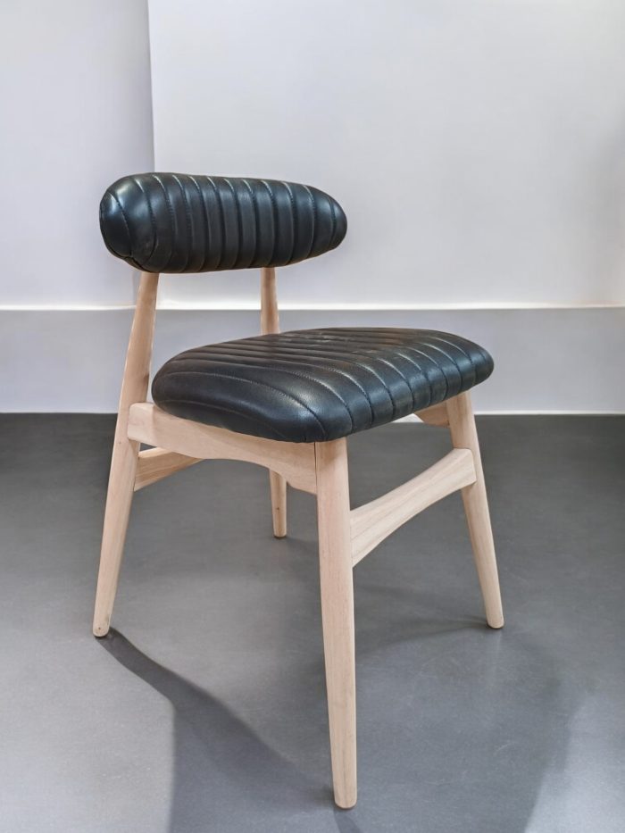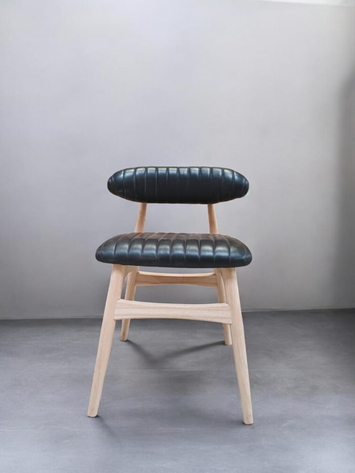 The Loom Noir Chair is a striking blend of bold contrast and minimalist design. It features a sturdy frame crafted from smooth solid teak wood, creating a natural and inviting foundation. The seat and backrest are upholstered in black genuine leather, featuring a distinctive ribbed texture that adds a touch of modern sophistication. Its clean lines and harmonious pairing of natural wood with black leather make it a standout piece, perfect for elevating any dining space, study, or living area.