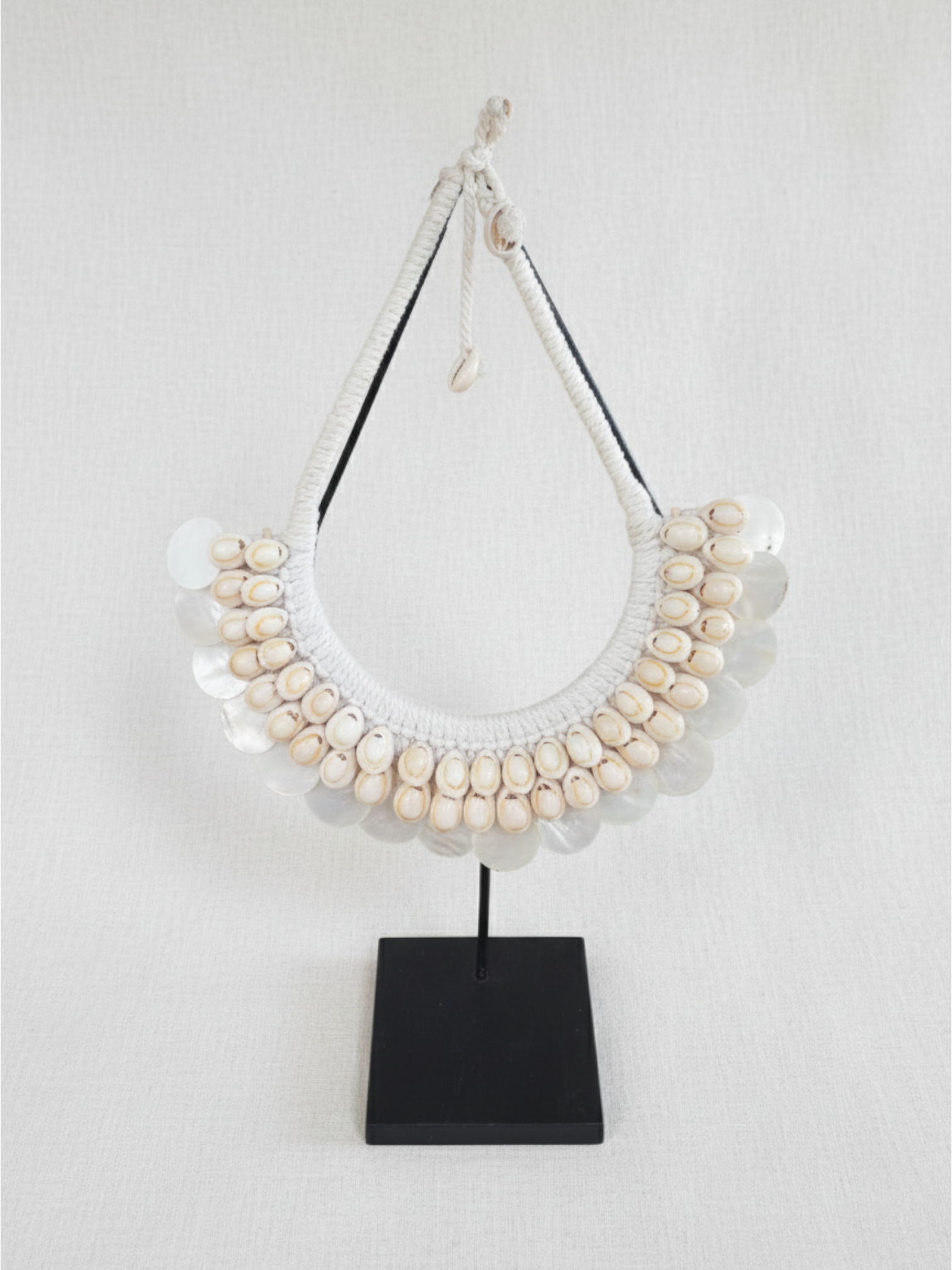 Materials: Polished Cowrie Shells, Mother-of-Pearl Discs, Cotton Macramé, and a Powder-Coated Metal Stand.