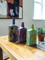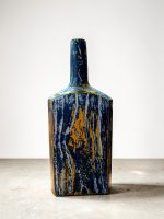 The Mavericks L is a striking decorative vessel that merges classic pottery forms with a bold, contemporary distressed finish. This artisanal bottle features a tall, slender neck and a substantial rectangular body, serving as a canvas for a high-contrast color palette. The surface is hand-finished with a weathered “crackled” effect, where deep midnight blue meets vibrant golden yellow, revealing layers of texture that suggest a piece reclaimed from the sea or a vintage industrial setting. Whether displayed as a standalone sculpture or used to hold dried botanical arrangements, the Mavericks L brings a pop of artistic energy and rustic-modern flair to any tabletop or shelving unit.