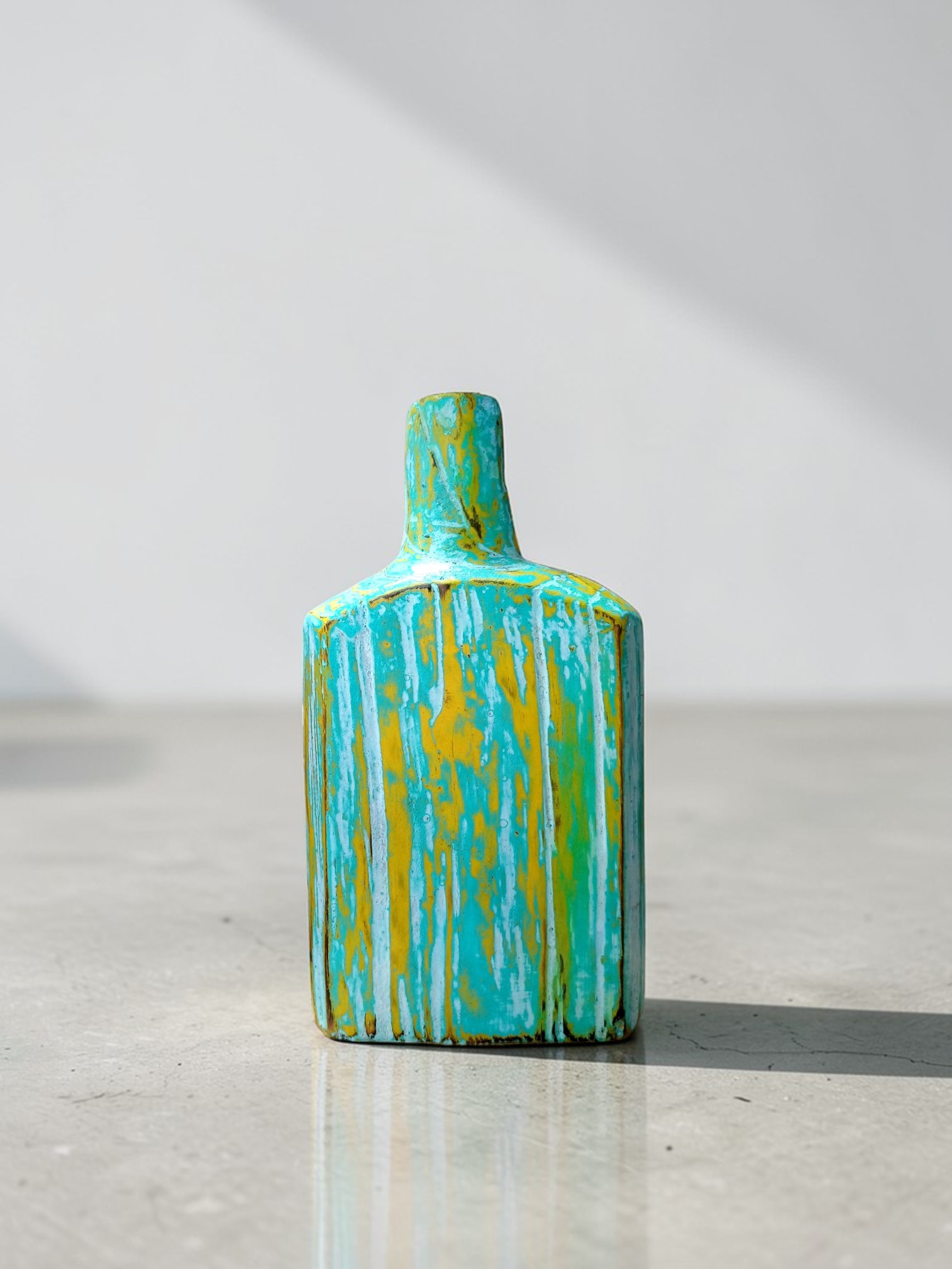 The Mavericks S is a vibrant, small-scale decorative piece that packs a massive punch of color and artisanal character. Hand-carved from solid Alba wood, this bottle features a shorter, sturdier profile compared to its larger counterparts, yet maintains the same distinctive rectangular body and slender neck. The surface is treated with a bold, distressed “crackled” finish, where bright turquoise green and sunny yellow collide to create a weathered, tropical aesthetic. Its unique texture and high-energy color palette make it an ideal accent for bringing a playful, eclectic vibe to small niches, bedside tables, or clustered shelving displays.