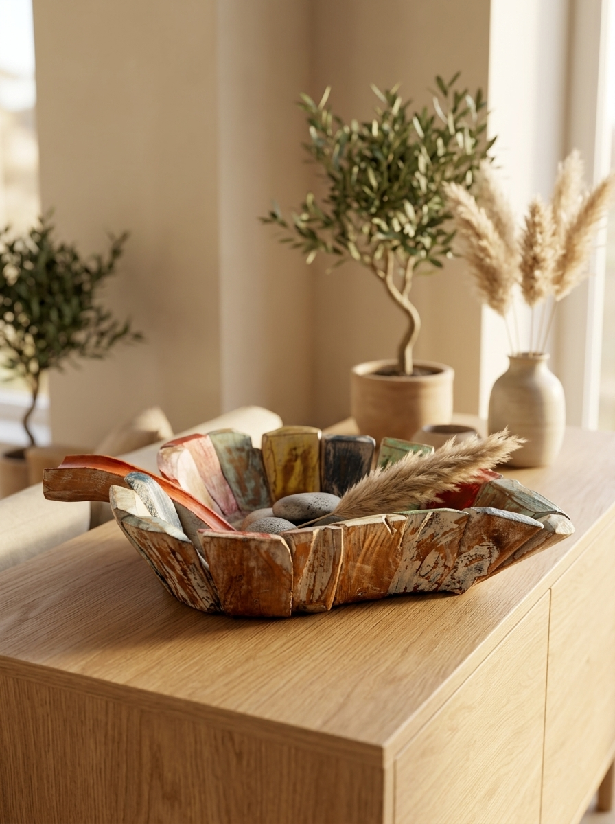 The Mosaic Leaf Carving is an artistic tribute to nature’s intricate patterns, designed to bring a fresh, organic energy to your interior. Hand-carved from sustainable Alba wood, this sculpture features a stylized leaf silhouette characterized by its dramatic open-work mosaic pattern. The interplay between the solid hand-carved sections and the geometric voids creates a beautiful sense of depth and movement, making it a captivating piece for any tabletop or shelf. Finished with a vibrant, distressed technique, it perfectly balances contemporary design with the raw, artisanal charm of traditional woodcraft.