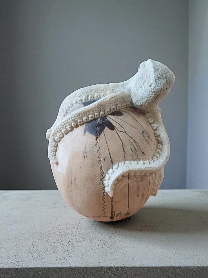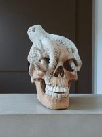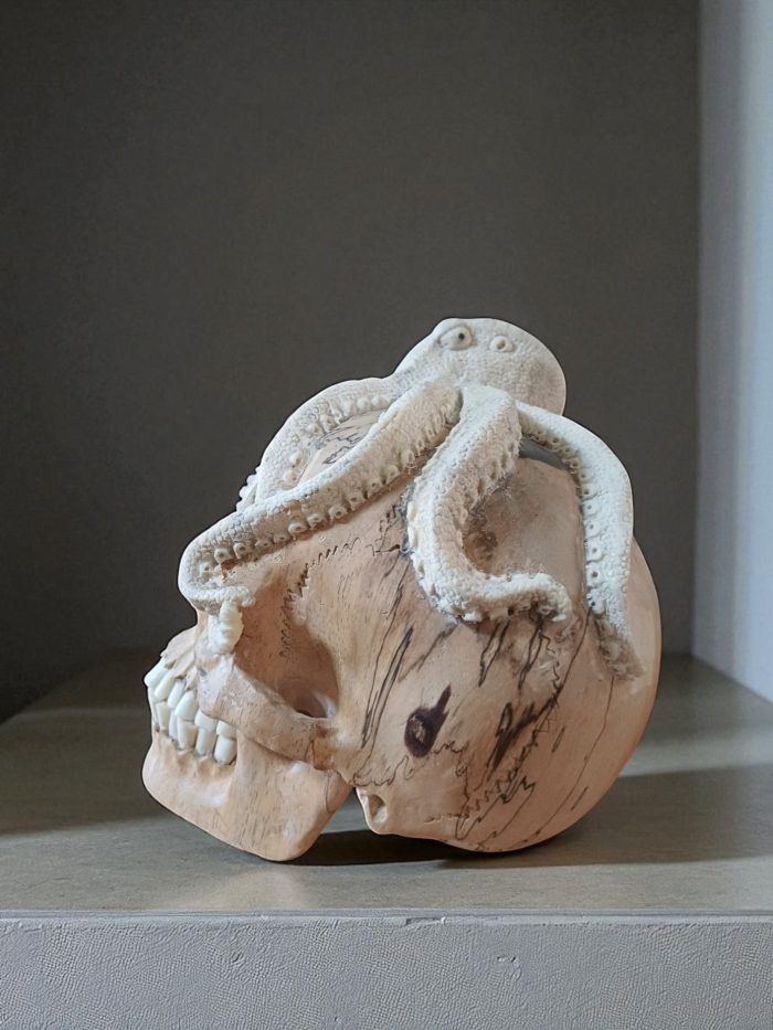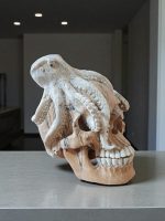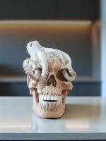 Description: An extraordinary hand-carved sculpture featuring an octopus made of genuine bone, intricately coiled around a human skull crafted from Tamarin wood. This unique piece combines the rustic charm of wood with the authentic texture of bone, making it a compelling centerpiece for any collection.