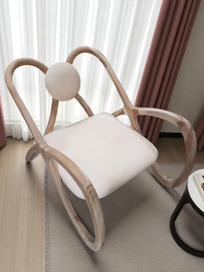 The Orbit Chair is a truly distinctive and artistic piece that reimagines seating with its captivating design. The chair’s frame is a sculptural marvel, crafted from beautifully curved teak wood finished in a Natural Teak Finish, creating a fluid, continuous loop that defines its unique silhouette. A perfectly spherical backrest and a subtly curved seat, both in a contrasting matte white fabric, seem to “orbit” within the wooden frame, giving the chair its namesake and a playful, modern edge. This statement piece is perfect for adding a touch of avant-garde design to any contemporary living space, gallery, or creative studio.