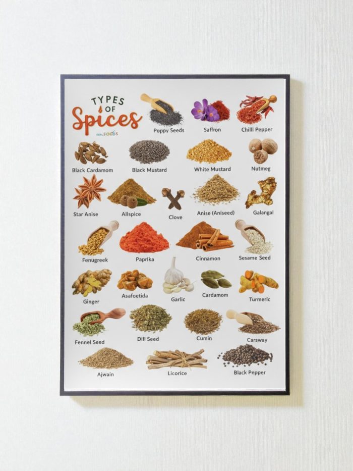 The Types of Spices Educational Print is a visually rich and comprehensive piece of wall art perfect for any kitchen, pantry, or culinary space. The poster showcases 27 distinct spices, ranging from common kitchen staples like Black Pepper and Garlic to more exotic ingredients like Saffron, Galangal, and Asafoetida. Each spice is presented as a vibrant, high-quality photograph, often featuring whole and ground forms, and is clearly labeled with its name. With its clean layout and elegant black frame (as pictured), this print functions as both a practical reference guide and a captivating piece of culinary decor, adding a professional and colorful touch to your home.