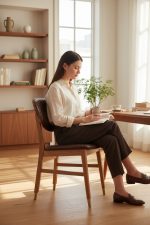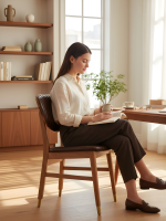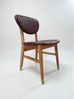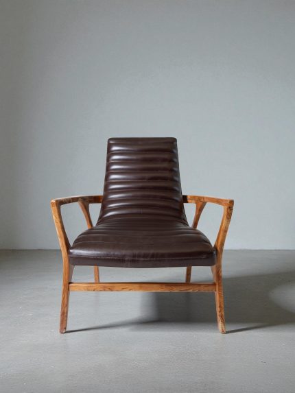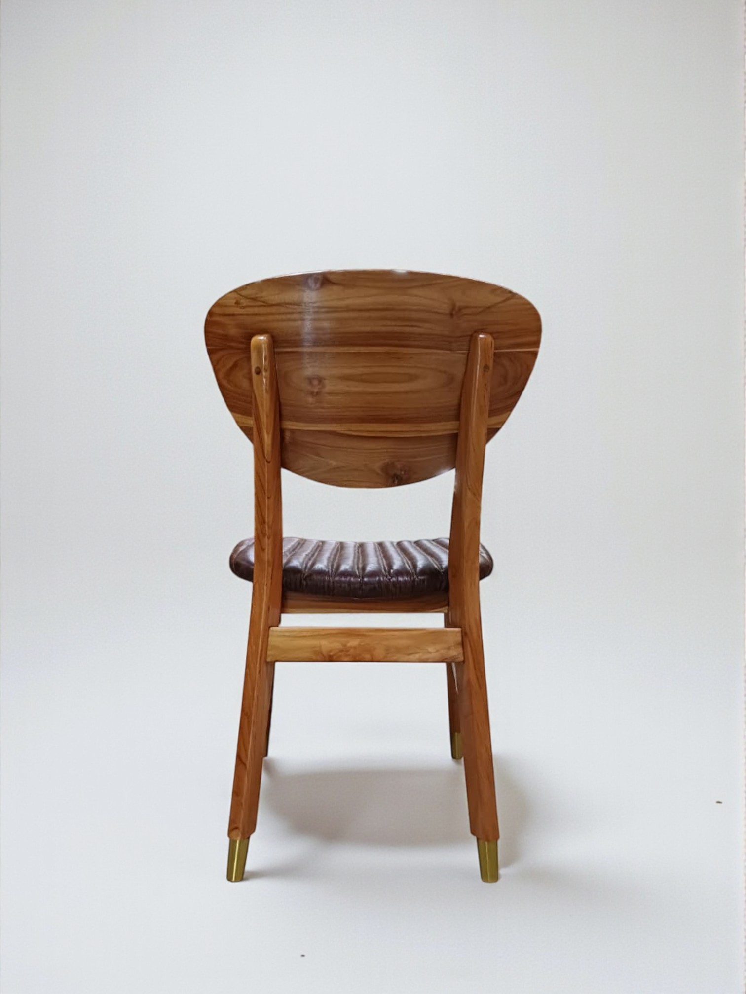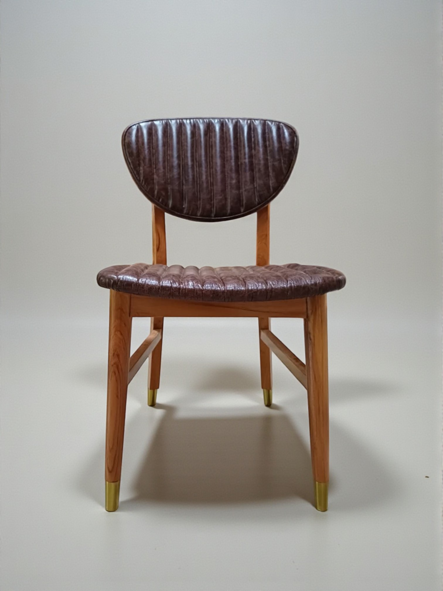 The Quiltis Chair is an elegant dining chair that beautifully captures the essence of Mid-Century Scandinavian design with a refined, contemporary update. The chair features a sturdy, tapered frame crafted from warm, natural wood and stands out with subtle brass tips on the front legs for a touch of luxe. The seat and the distinctly curved backrest are upholstered in deep brown leather with a visually rich quilted or channel-tufted texture, adding superior comfort and a sophisticated contrast to the light wood. This chair is perfect for a modern dining room or as a stylish accent piece in a study.