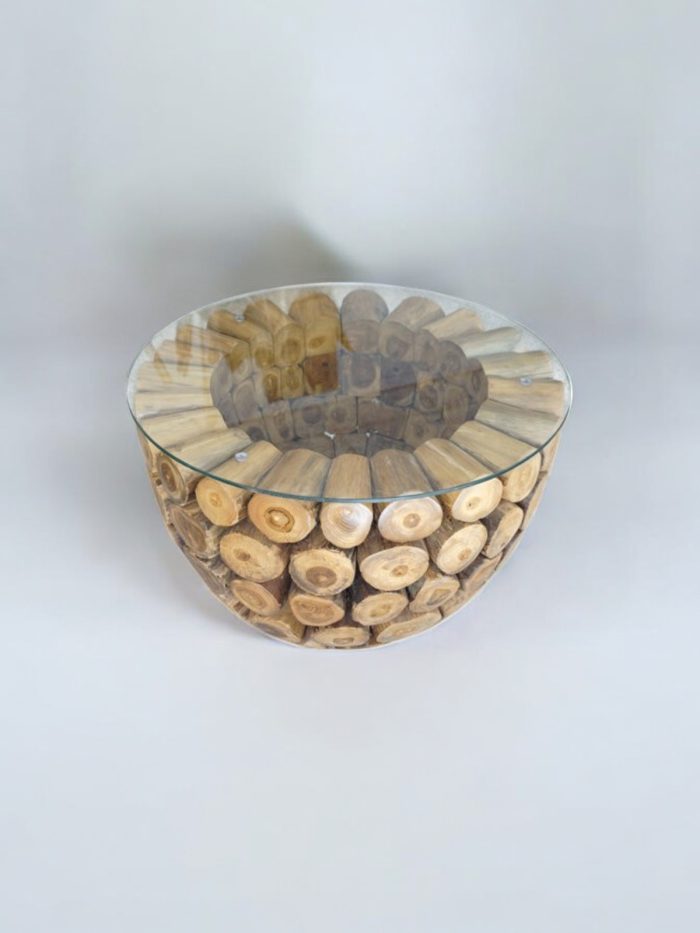 The Round Bowl Coffee Table is a captivating piece that beautifully merges rustic charm with contemporary design. Its unique bowl-shaped base is meticulously crafted from countless individual slices of natural wood logs, arranged to create a textured and organic mosaic. The varied tones and visible grain of the wood pieces add warmth and character, making each table one-of-a-kind. Topped with a sleek round tempered glass surface, it offers both functionality and an unobstructed view of the stunning base below. This coffee table is an exceptional statement piece for Bohemian, Rustic, Coastal, or Organic Modern living spaces, adding a touch of natural artistry.