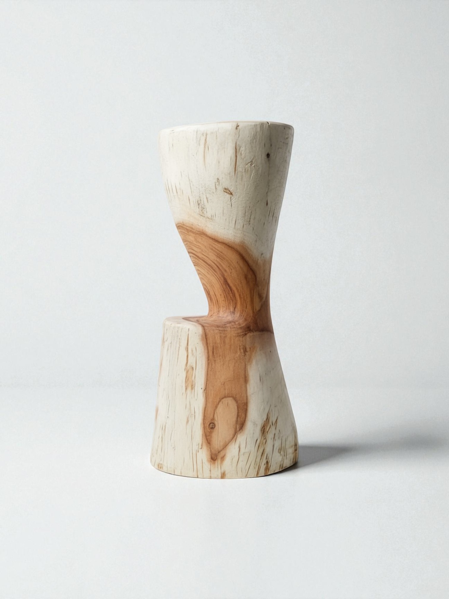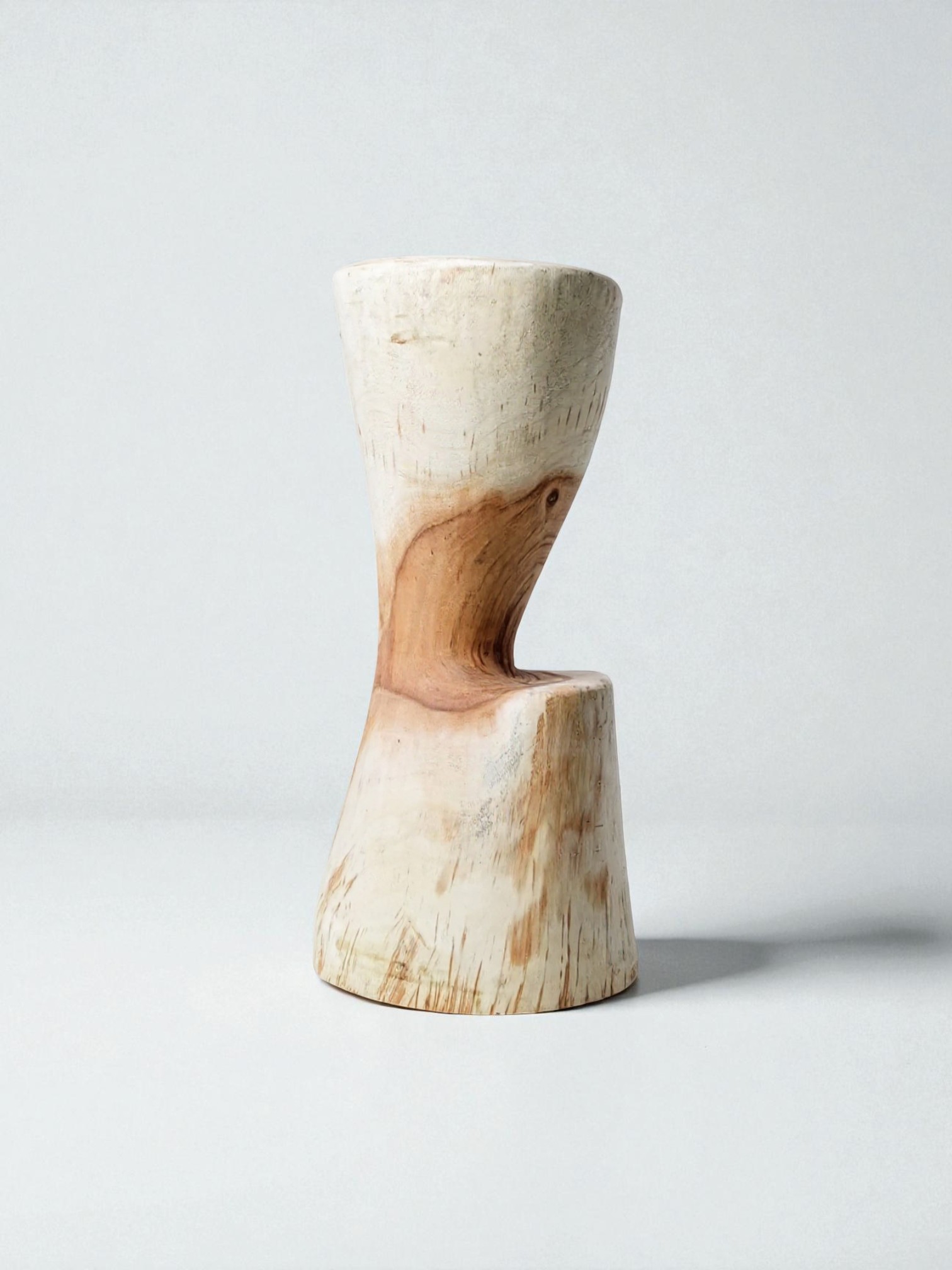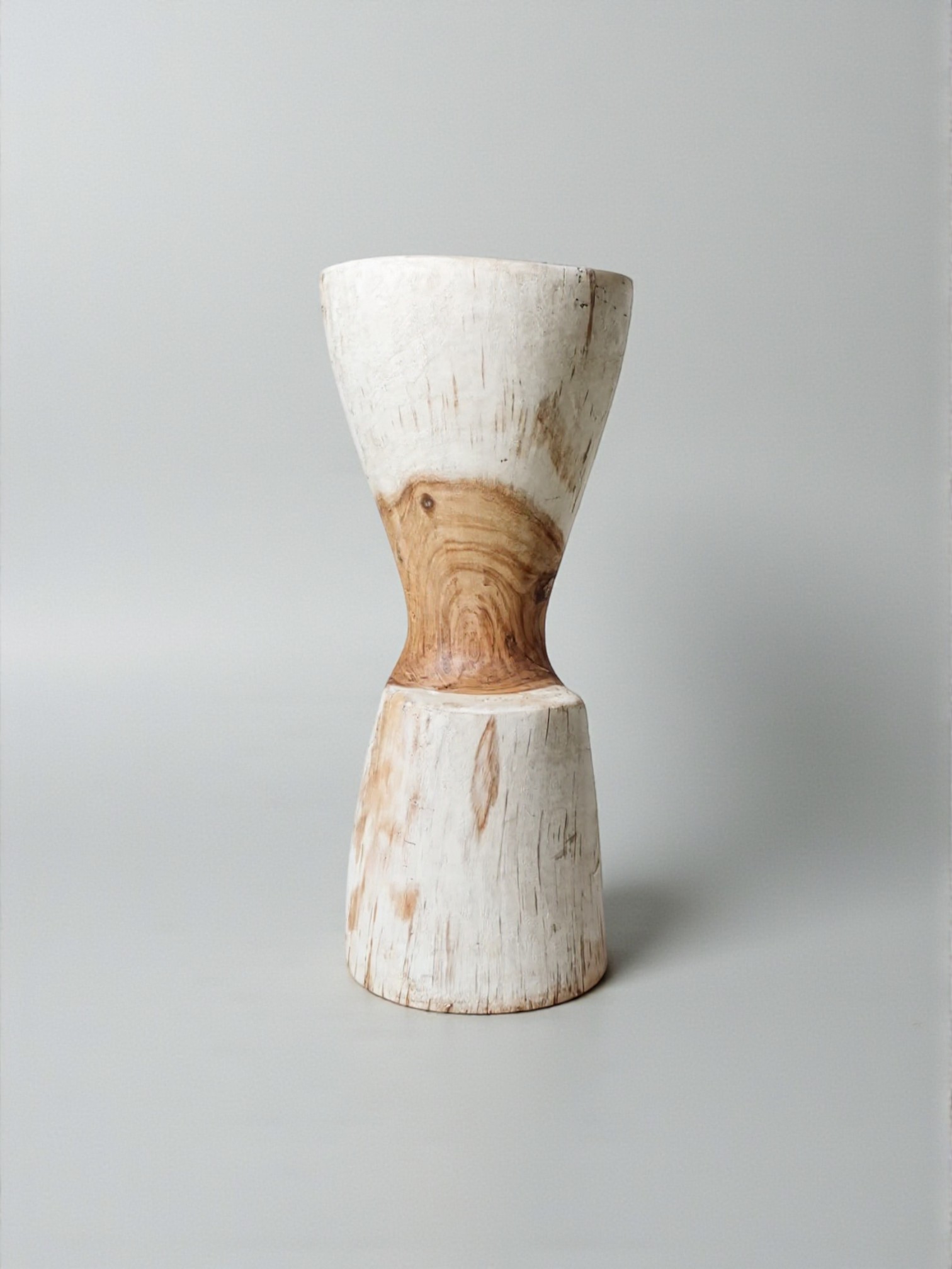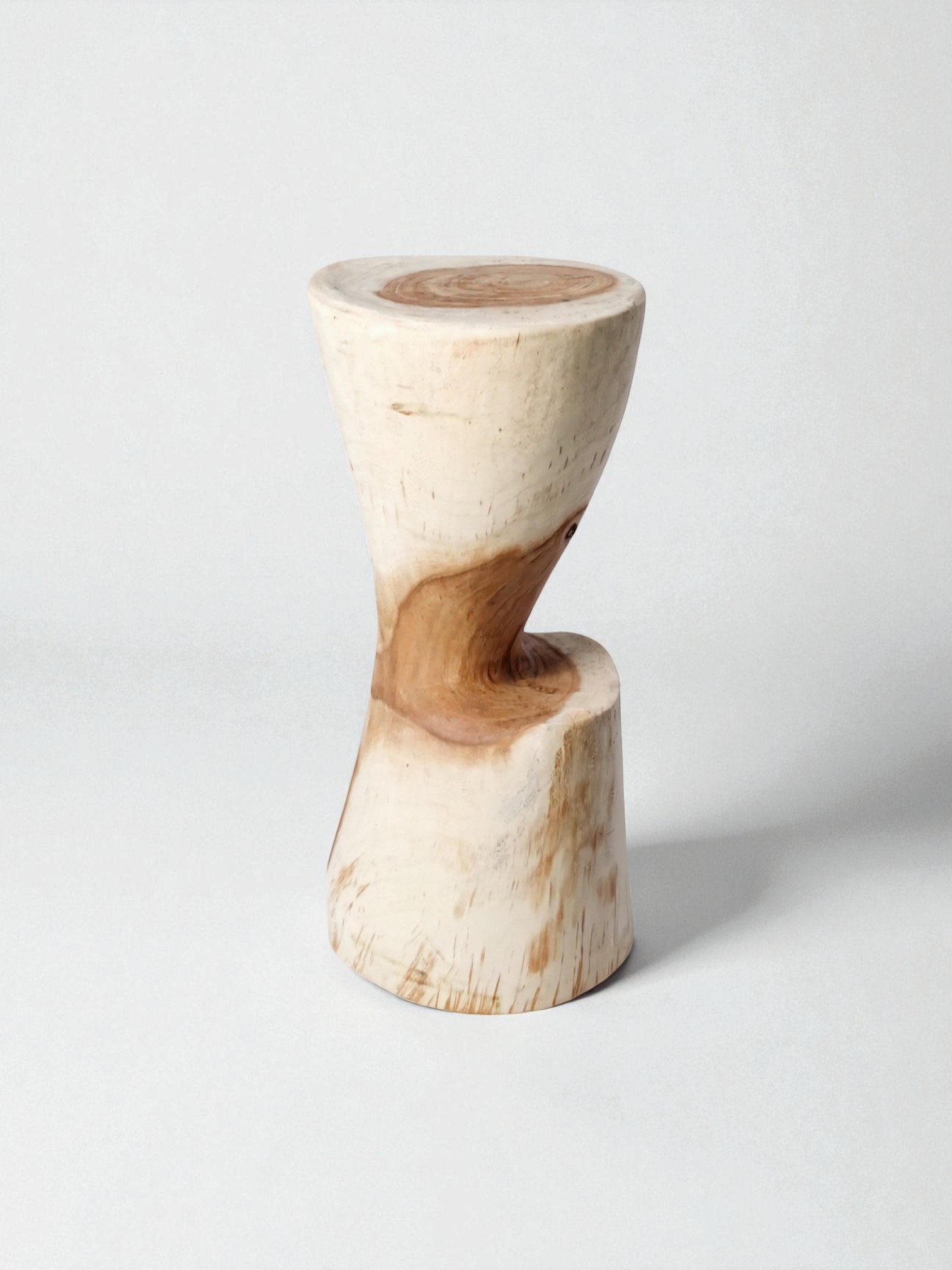 The Sankala Stool is a powerful, sculptural accent piece carved from a single block of Suar wood. Its organic design features a distinct hourglass silhouette with a smooth, concave curve at the center, contrasting with the sturdy, solid top and bottom bases. The natural beauty of the Suar wood is highlighted by its varied grain patterns, showing warm brown tones mingling with paler, weathered surfaces. This piece functions beautifully as a unique side table, a decorative pedestal, or a rustic accent stool. The Sankala Stool is a grounding element perfect for Organic Modern, Wabi-Sabi, or Rustic Contemporary interior styles.