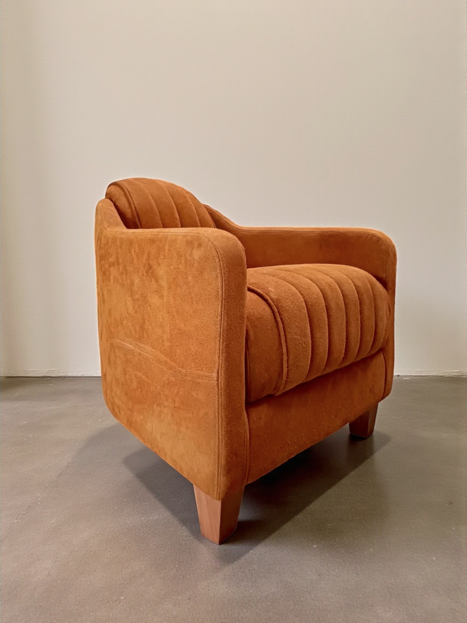 The Sienna Armchair is a plush, compact statement piece that effortlessly combines cozy comfort with elegant Art Deco flair. Its defining feature is the upholstery, which utilizes vertical channel tufting across the backrest and the entire interior, adding rich texture and a distinctly vintage profile. The arms gently curve outwards, creating an inviting, enveloping silhouette. Upholstered in a luxurious, soft velvet fabric in a vibrant burnt orange or terracotta hue, this chair is set on low, warm wooden legs. The Sienna Armchair is the perfect addition to a reading nook, a bedroom, or as a contrasting accent piece in any Mid-Century or Transitional living space.