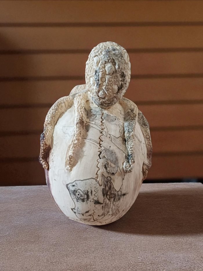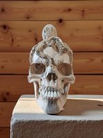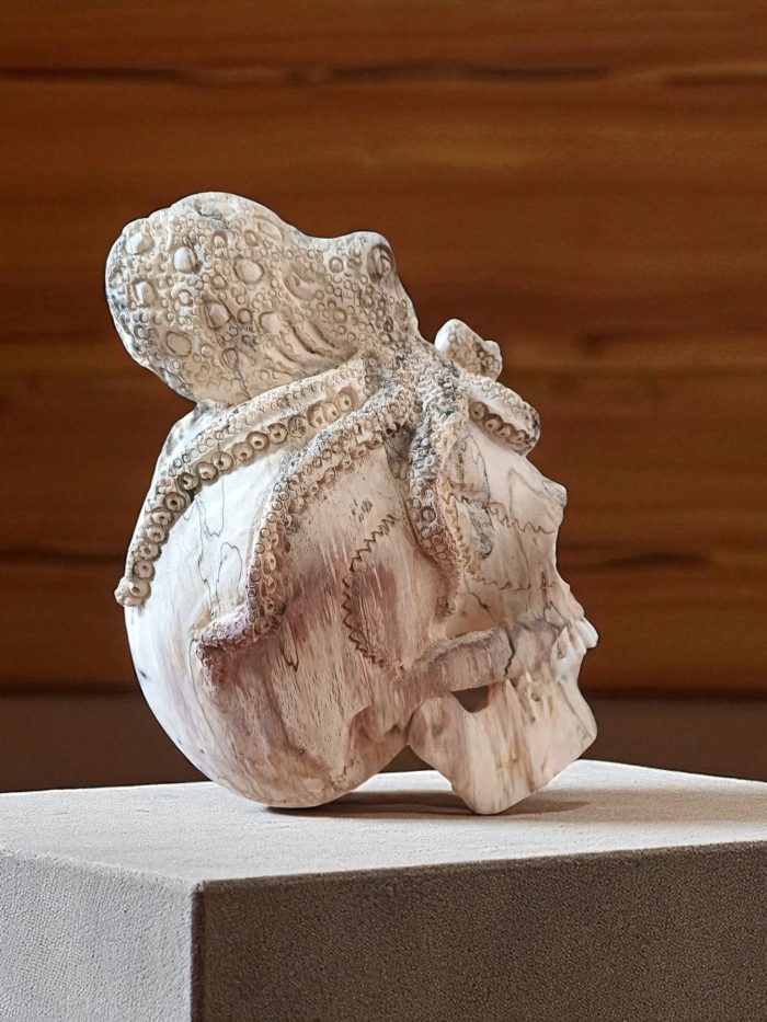 Crafted from a unique combination of tamarind wood and bone, this striking sculpture captures the eerie beauty of the deep sea. The intricately carved human skull is enveloped by a meticulously detailed octopus, its tentacles clinging to the cranium with an unsettling grace. The natural grain of the tamarind wood gives the piece a rustic, ancient feel, while the bone elements add a touch of authentic macabre. It represents a powerful union of mortality and the mysterious ocean, making it a perfect addition to a gothic-themed room, an artist’s studio, or a curio cabinet.