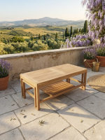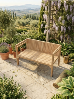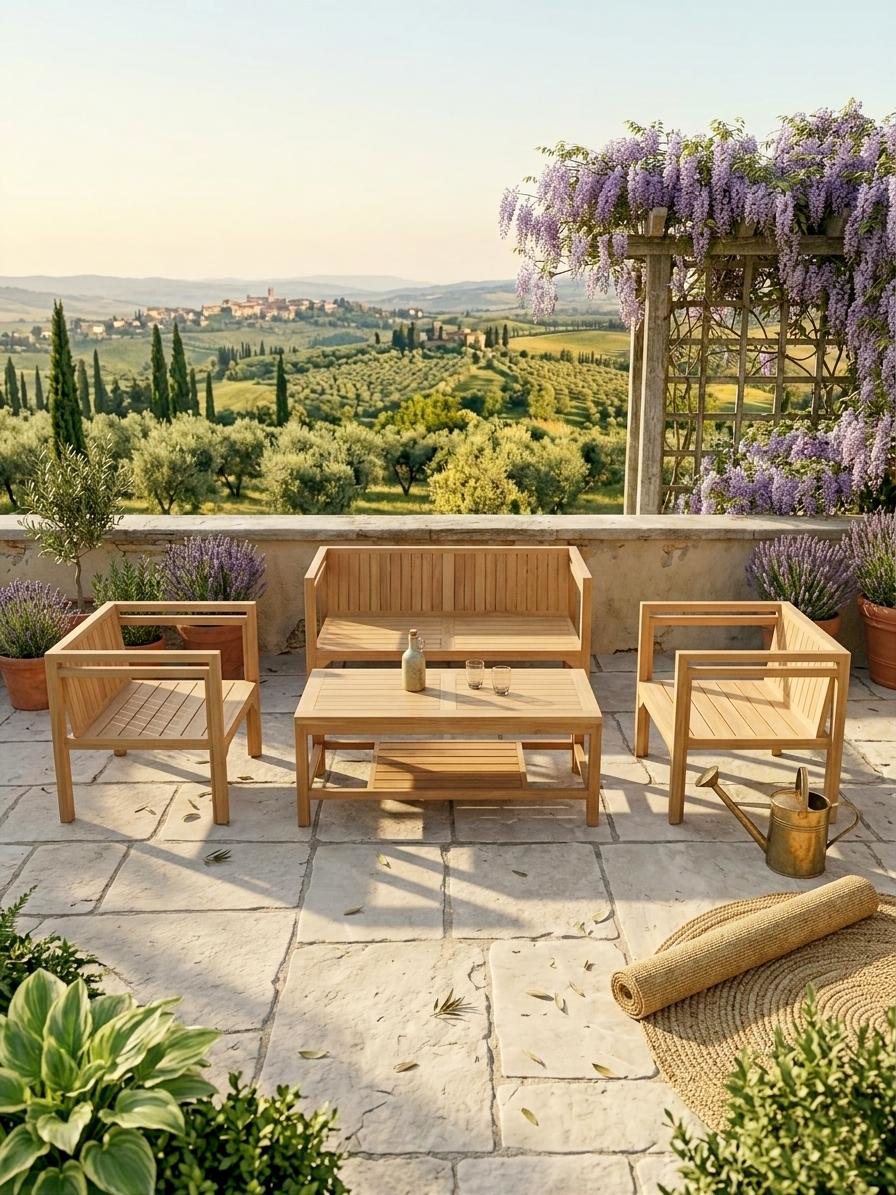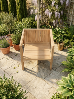 The Linear Teak Patio Set is a 4-piece outdoor collection that exemplifies modern geometric elegance and functional durability. Each piece in this collection is masterfully crafted from premium solid Teak wood, known for its natural resistance to outdoor elements. The design features a bold, slatted wooden frame with high armrests and a deep seating profile, creating a structured yet inviting atmosphere for any outdoor living space. The clean, architectural lines allow the natural golden-brown grain of the teak to take center stage, making it a sophisticated addition to a contemporary patio, terrace, or sun-drenched garden.