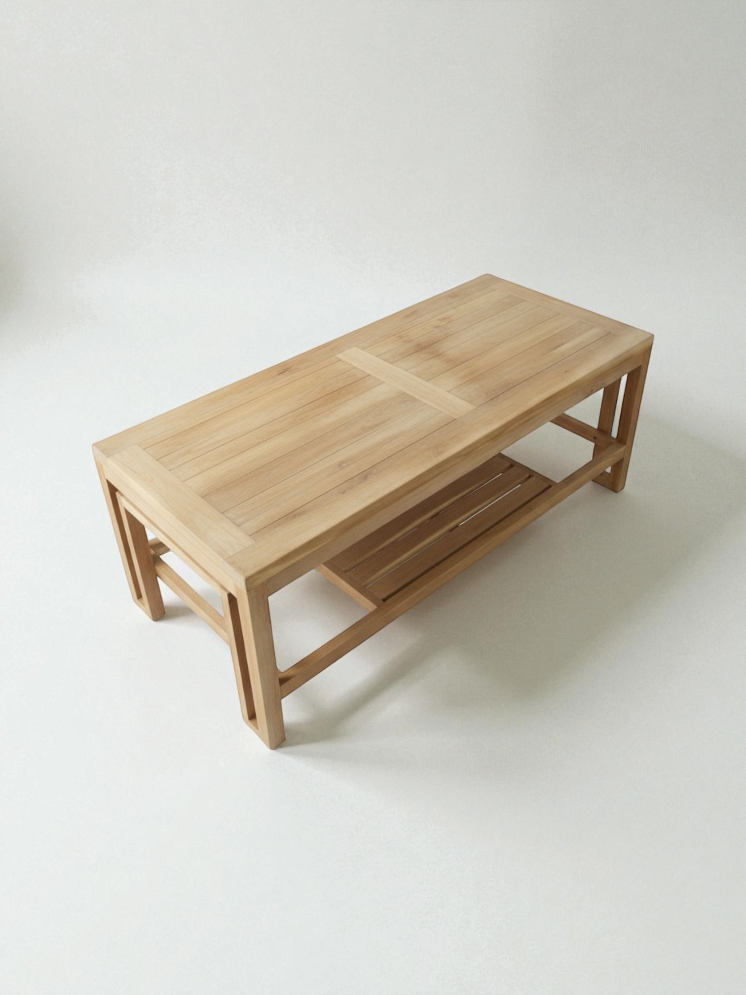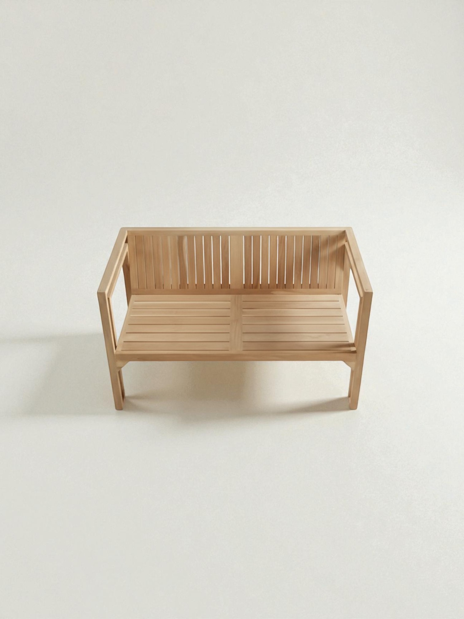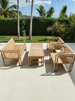 The Sofa Set Of 4 is a minimalist and robust outdoor lounge collection designed for enduring style and comfort. This set includes a loveseat (sofa), two armchairs, and a matching coffee table, all featuring a clean, boxy silhouette characteristic of Organic Modern design. Each piece is constructed entirely from solid teak wood in its unfinished, natural state, allowing the wood to develop a beautiful, protective silver-gray patina over time when exposed to the elements. The wide, horizontal slats and broad armrests emphasize durability and a sophisticated, contemporary aesthetic, making this set the perfect, long-lasting anchor for any patio, garden, or poolside lounge area.