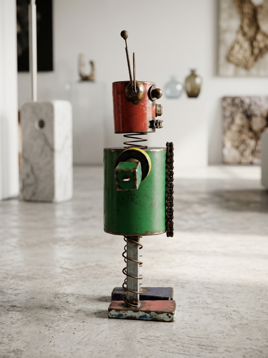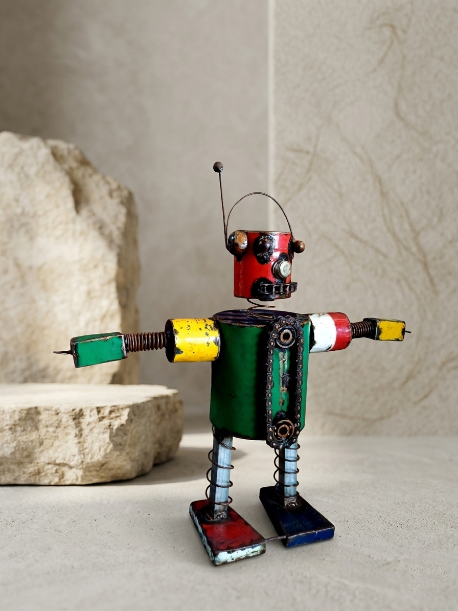 The Sparky Robot is a whimsical and imaginative sculpture that breathes new life into industrial salvage. This handcrafted character is assembled from a creative mix of reclaimed materials, including metal canisters for the body and head, heavy-duty drive chains for mechanical detailing, and industrial springs that serve as flexible limbs. With its quirky antenna and wide-eyed expression, Sparky exudes a retro-futuristic charm. Each piece is hand-welded and features an authentic distressed finish, making it a unique, eco-conscious art piece that adds a playful, industrial edge to any creative workspace, child’s room, or modern gallery.