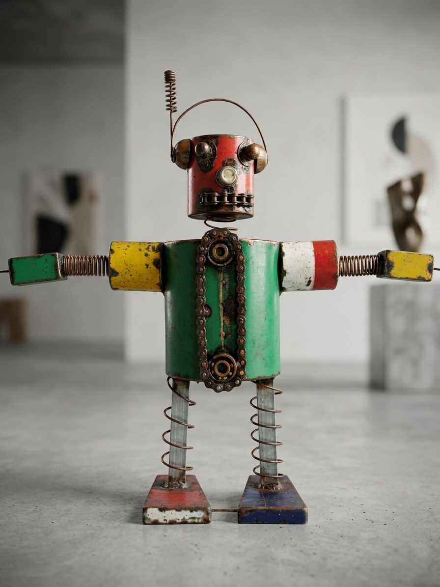 Style: Steampunk, Industrial Upcycled Art, Retro-Futurism.