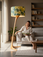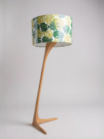 The Stiletto Lamp is a stunning floor lamp that combines sleek, sculptural design with a vibrant, tropical flair. The base features a dramatically curved wooden column that rises from a stable, low-profile foot, giving the lamp its elegant, tapering silhouette. This natural, smoothly finished wooden frame is topped with a large cylindrical drum lampshade upholstered in a fabric displaying a lively green and yellow leaf/Monstera pattern. The contrast between the organic, refined wood base and the bold, graphic shade makes the Stiletto Lamp a perfect statement piece for Mid-Century Modern, Contemporary, or Bohemian spaces, adding both directional light and significant decorative impact.