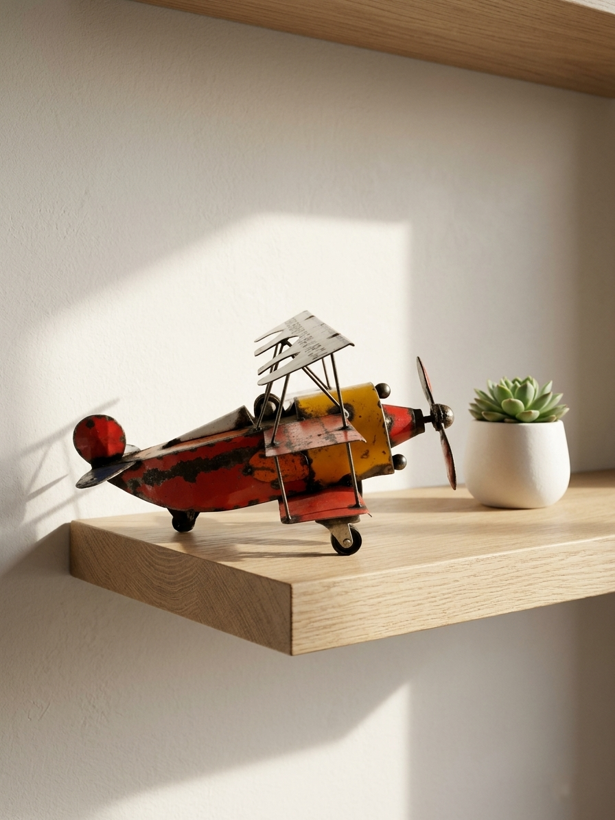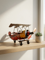 The Vintage Biplane (TF132DL) is a nostalgic tribute to the golden age of aviation, masterfully handcrafted from upcycled industrial metal. This intricate sculpture captures the classic double-wing design of a historical aircraft, complete with a rotating three-blade propeller and rugged landing wheels. Every piece is uniquely constructed from reclaimed sheet metal, preserving the original distressed textures and weathered paint to give it an authentic, antique feel. Whether displayed on a study bookshelf, a mantelpiece, or a child’s room, this eco-friendly art piece serves as an inspiring symbol of adventure and timeless craftsmanship.